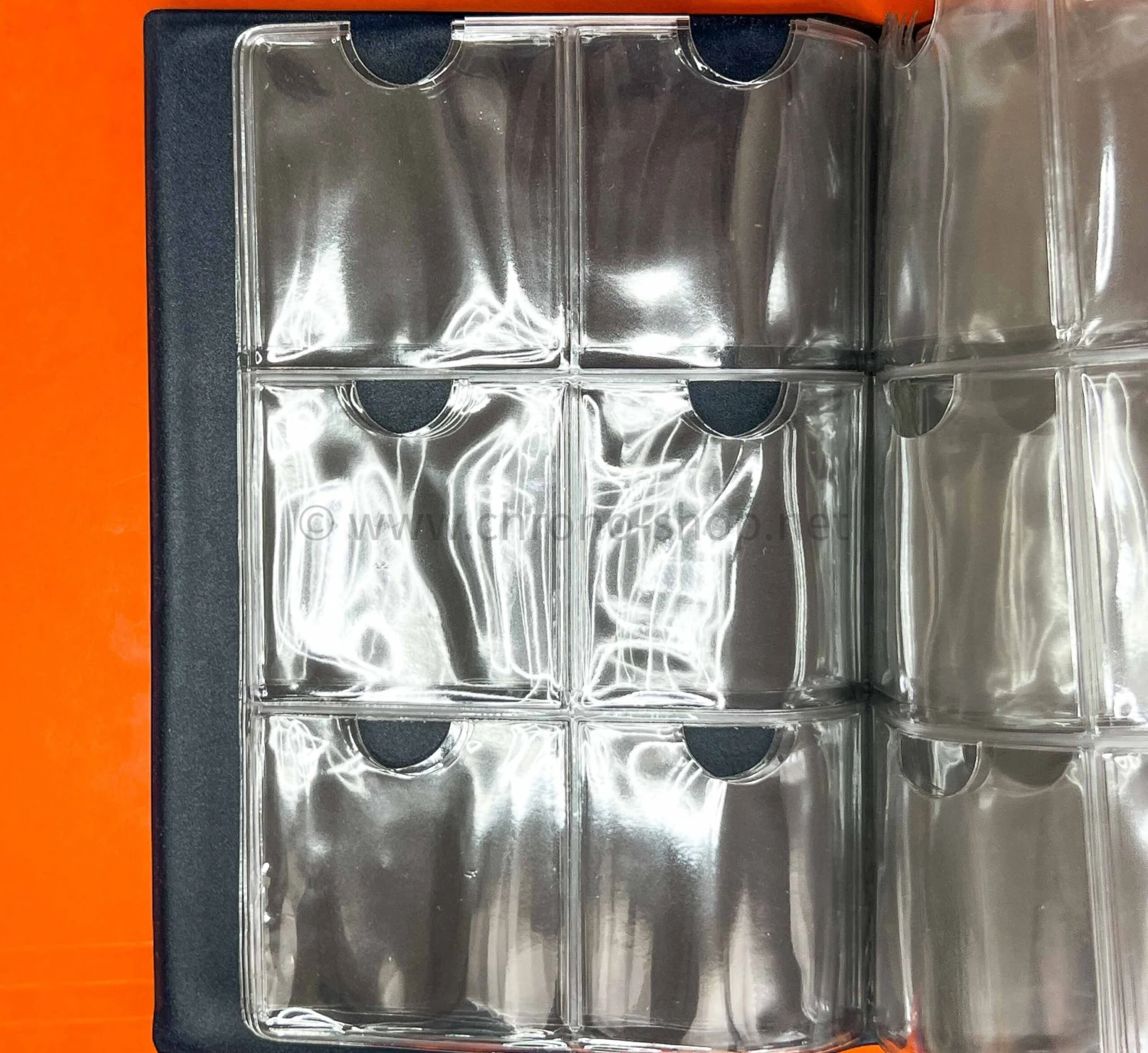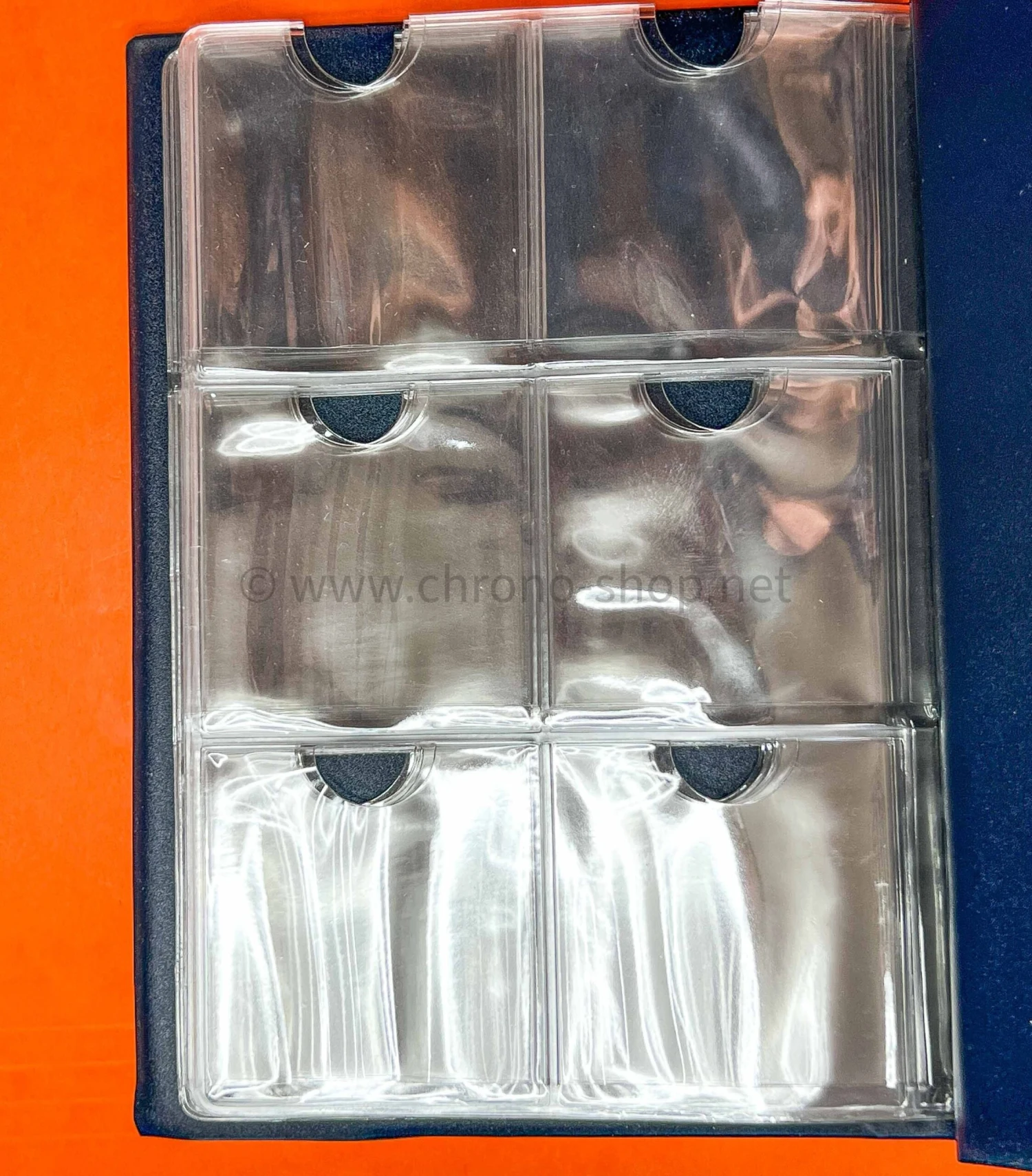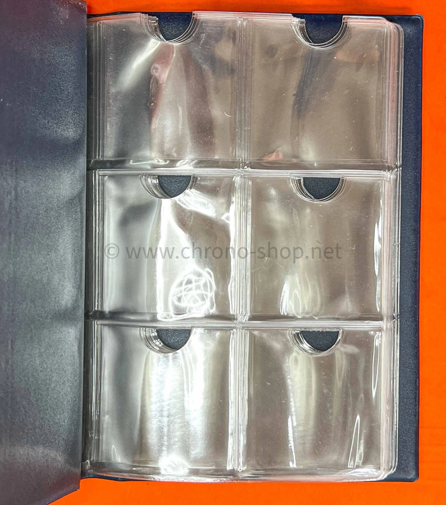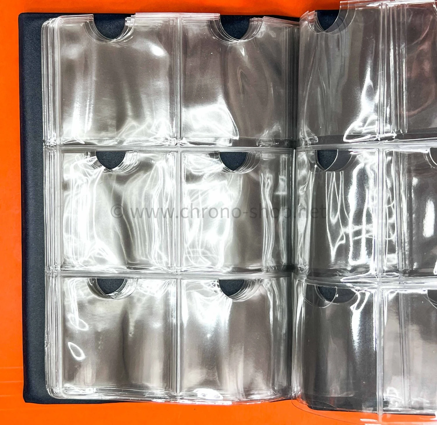 Chaque page transparente contient 6 compartiments carrés mesurant chacun 5,3 x 5,3cm avec encoche supérieure permettant de manipuler votre cadran.